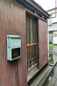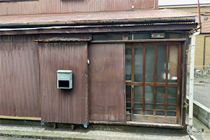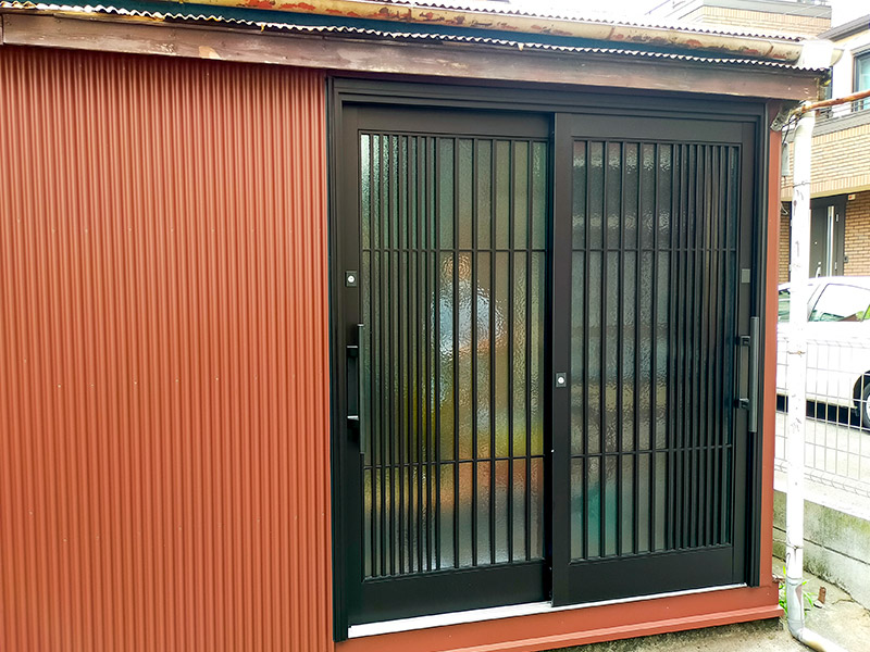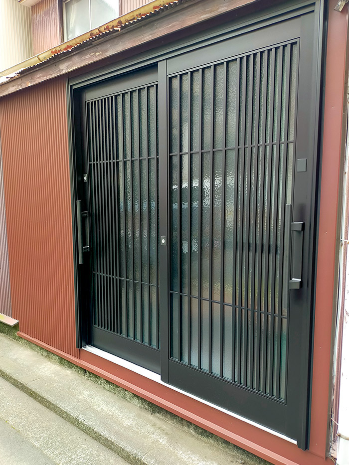 玄関ドア:YKKap ドアリモ 玄関引戸 (アルミ仕様、C16型、色:カームブラック) 他:壁トタン交換 |